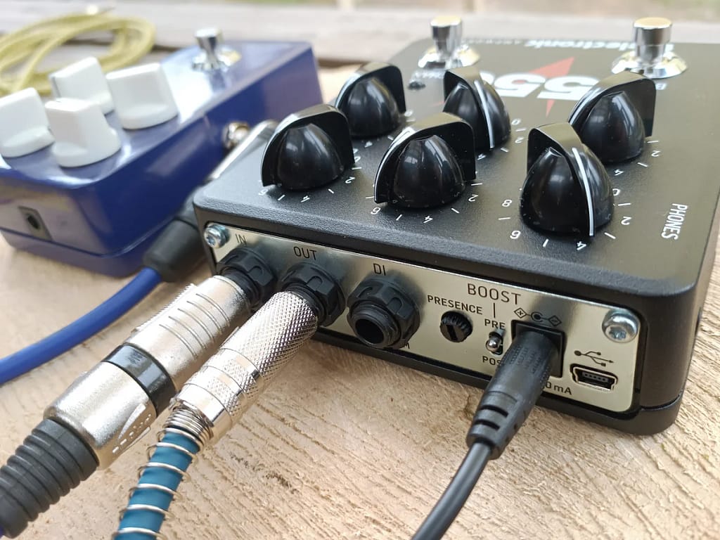 Výstup z V550 můžeme zapojit do silové sekce zesilovače, v takovém případě použijeme zdířku na jack označenou jako OUT. Druhou zdířkou označenou jako DI s dodatkem CAB SIM posíláme ven signál obohacený o simulaci reproboxu. Na zadním panelu máme také otočný ovladač pro funkci Presence a dvoupolohový přepínač pro nastavení funkce Boost. Vstup pro USB využijete při aktualizace firmwaru.
